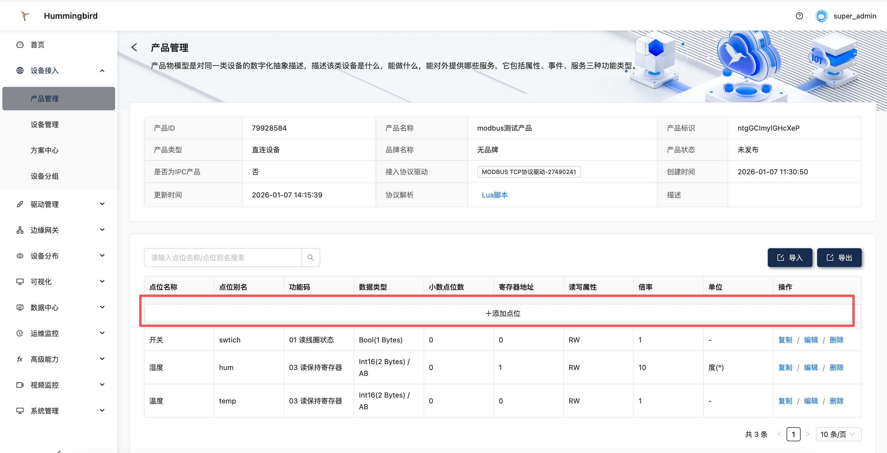 点击产品详情按钮,进入产品详情页面,点击添加点位按钮可以新增采集点。
